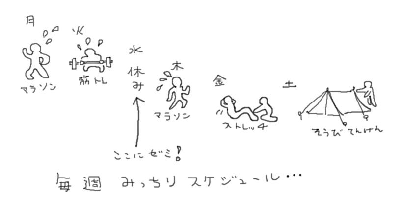月曜日はサークルハウス(大学から少し離れた所に四階建ての建物があり、そこが運動部や文化部の活動拠点になっていました)から大学までの道路をマラソン。大学は扇状地にあったので高低差が半端なく、マラソンどころか歩き通すのも大変でした。