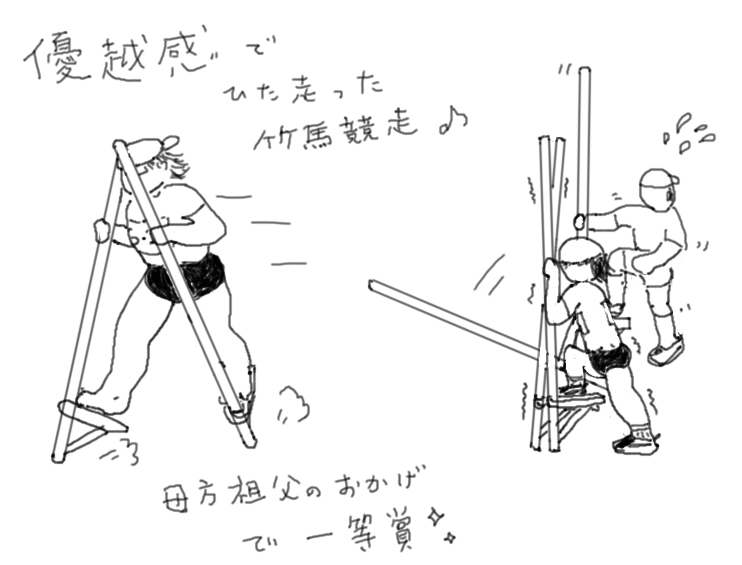 次の競技は竹馬のかけっこーー誰も手を挙げる人が無く、「じゃ、私、行く」と名乗り出ました。竹馬は、以前、母方祖父が作ってくれた事があり、乗り慣れた遊び道具でもありました。