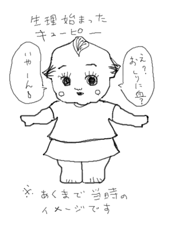 初潮を迎えたばかりの頃は無自覚な事も多いから、スカートなどに経血が付いていたら教えてあげましょう的内容をキューピーが熱演。