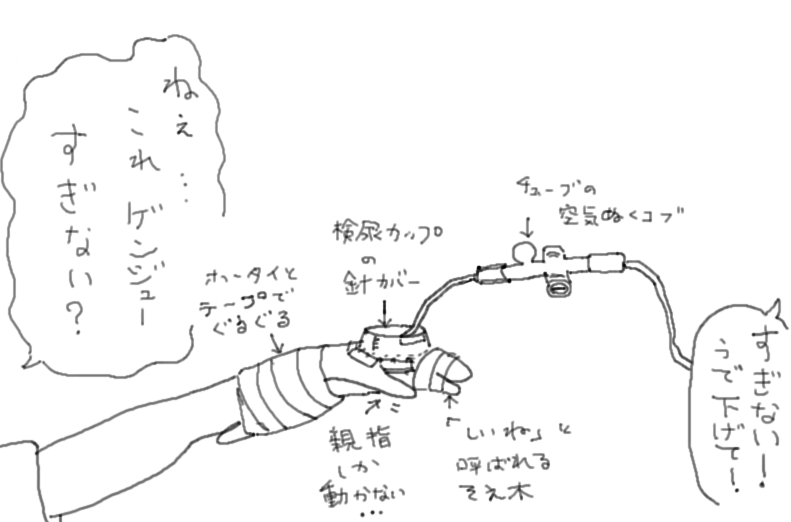 針が動いたり抜けたりしないよう検尿カップを加工した針カバーをテープで固定され、同じ理由で手首から腕にかけてシイネという金属板にホータイ巻きつけた添え木でガッチリ固定。どんなに寝相が悪い子どもでもこれなら安心……看護師さんは、ね。