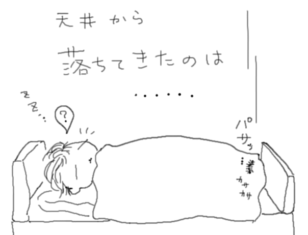入学式前(春休み中だったかな)で、引越し荷物もあらかた片付いた晩のこと。深夜、ふと目が覚めると、天井でかすかな音がしているのに気付きました。Gだったら嫌だなぁなんて思いながらうつらうつらし始めると、今度は何かが布団の上に落ちる音が。