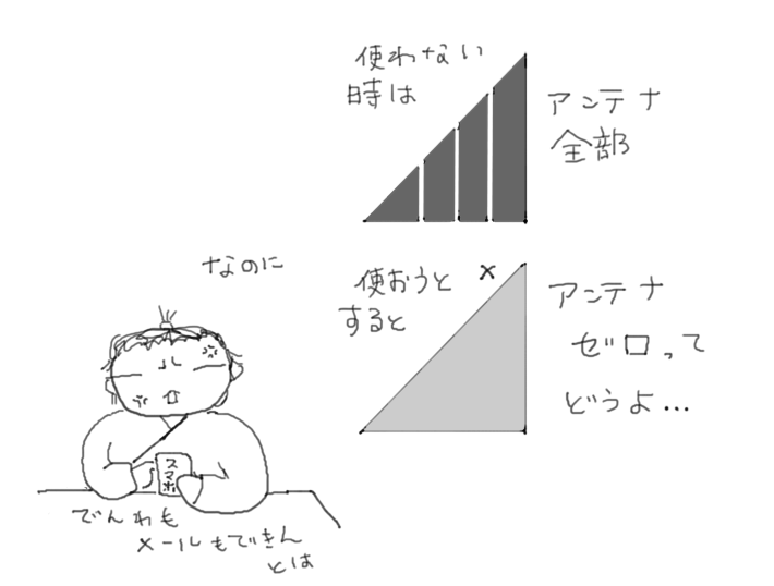 使わない時はアンテナ全開なのに、使おうとするとゼロになっちゃうのですよ。電話がかかってきても一瞬繋がるけどすぐ切れる。私もキレました。