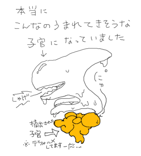子宮自体は内側にも外側にも筋腫が育っていて、まるでエイリアンーー摘出後のカラー写真頂きましたのーー肥大症と言われていた子宮のそこらに筋腫ができているのですから、癒着さもありなん、でした。