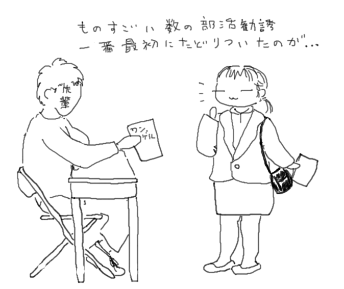 大学では、運動部か体を動かす文科系サークルに所属しようと思っていた私は、人酔いしやしないかビクビクしながらなるべく人の少なさそうな所に移動……ふと人混みが途切れて、ホッと顔を上げたら、長机に一人、パンフレット持って座っている先輩と目が合いました。