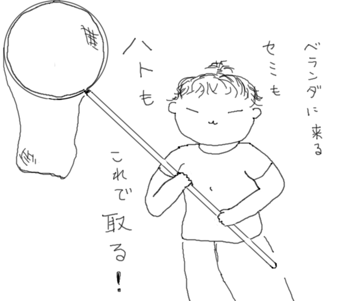 現在住んでいる所、最初の頃はハトがベランダにのさばっていたので、これも捕虫網で撃退。2年ほど前からカラスが進出してきて、ハトのフン害はなくなりました。